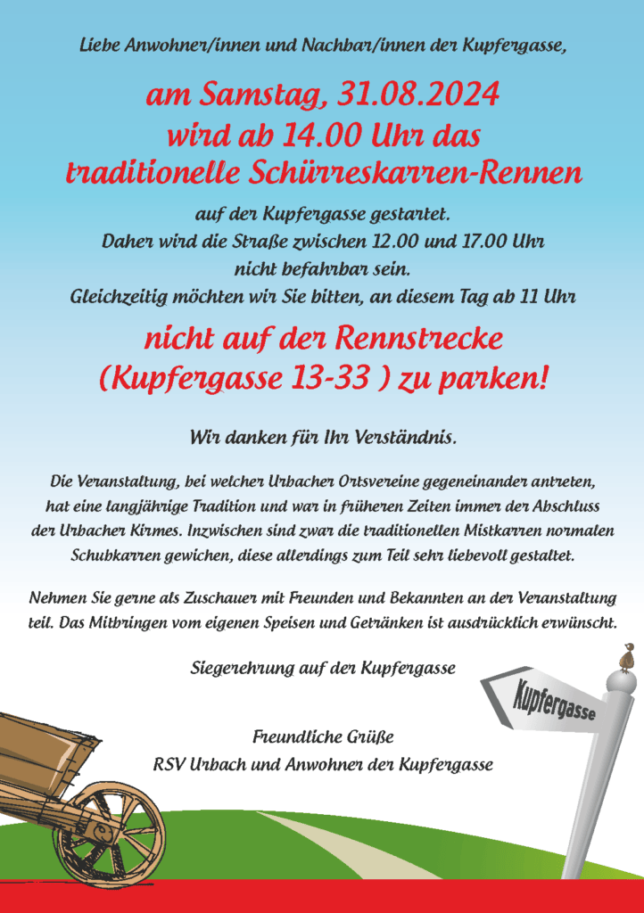 Am 31. August 2024 werden ab 14.00 Uhr wieder die Schürresskarren durch die Urbacher Kupfergasse fahren. Die Anwohner der Kupfergasse organisieren das Rennen erneut in Kooperation mit dem RSV Urbach und setzen damit die Tradition fort, in der sich Knechte und Mägde mit den nur geringfügig gereinigten Mistkarren einen Wettstreit durch das Dorf lieferten.