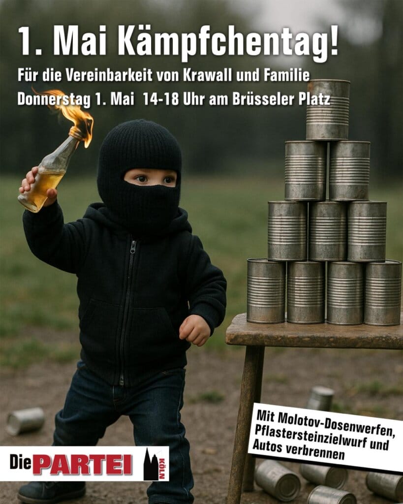 Am 1. Mai lädt Die PARTEI Köln zum „Kämpfchentag auf dem Brüsseler Platz“ ein.